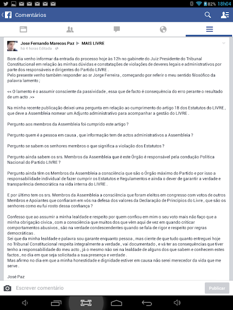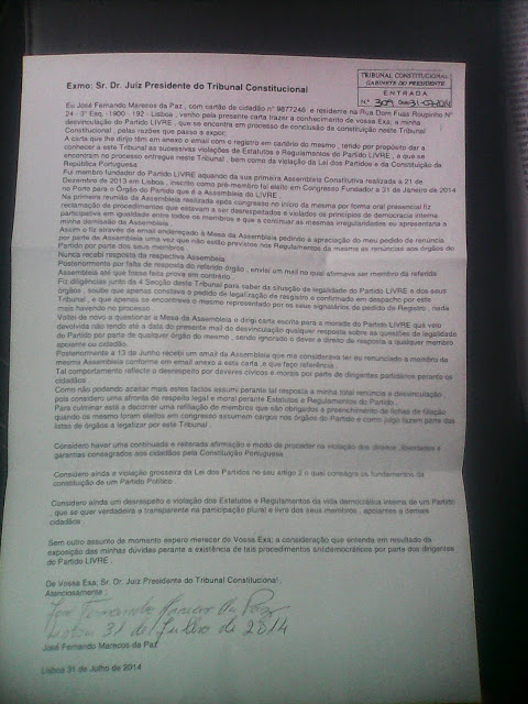 Eu José Fernando Marecos da Paz , com cartão de cidadão n° 9877246  e residente na Rua Dom Fuas Roupinho N° 24 - 3° Esq. -1900 - 192 - Lisboa , venho pela presente carta trazer a conhecimento de vossa Exa; a minha desvinculação do Partido LIVRE , que se encontra em processo de conclusão de constituição neste Tribunal Constitucional , pelas razões que passo a expor;