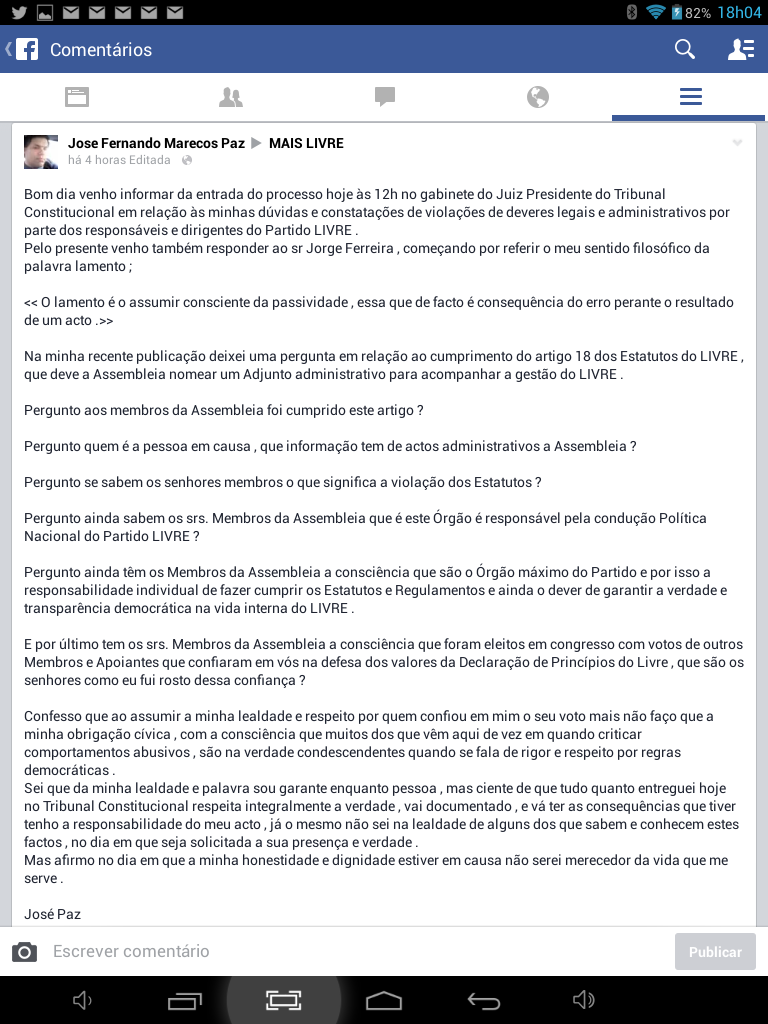 Voltei de novo a questionar a Mesa da Assembleia e dirigi carta escrita para a morada do Partido LIVRE que veio devolvida não tendo até a data do presente mail de desvinculação qualquer resposta sobre as questões de legalidade do Partido por parte de qualquer órgão do mesmo , sendo ignorado o dever e direito de resposta a qualquer membro apoiante ou cidadão.
